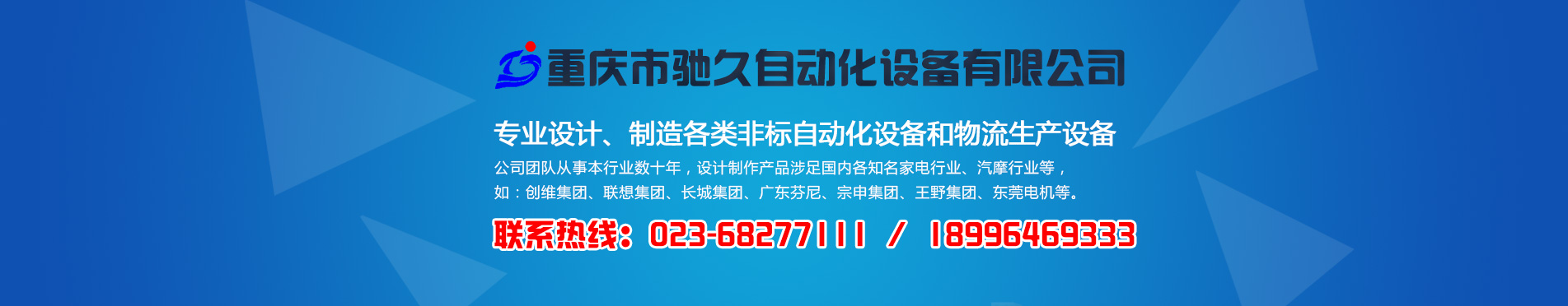 重慶市馳久自動(dòng)化設(shè)備有限公司是一家專(zhuān)業(yè)設(shè)計(jì)、制造各類(lèi)非標(biāo)自動(dòng)化設(shè)備和物流生產(chǎn)設(shè)備的綜合性企業(yè)。 公司以“馳而不息,久而彌篤”為發(fā)展理念,堅(jiān)持“憑誠(chéng)信獲市場(chǎng),靠質(zhì)量得效益”的企業(yè)宗旨,不斷創(chuàng)新理念,持續(xù)發(fā)展技術(shù),為客戶(hù)提供滿(mǎn)意的自動(dòng)化物流系統(tǒng)解決方案和非標(biāo)自動(dòng)化設(shè)備。 公司生產(chǎn)基地坐落在重慶市北碚區(qū)歇馬鎮(zhèn)天馬村,占地面積約5000平方米。公司擁有先進(jìn)的加工設(shè)備,配套激光切割機(jī)、數(shù)控剪板機(jī)和折彎?rùn)C(jī)等;同時(shí)擁有自動(dòng)涂裝生產(chǎn)線(xiàn)。 公司團(tuán)隊(duì)從事本行業(yè)數(shù)十年,設(shè)計(jì)制作產(chǎn)品涉足國(guó)內(nèi)各知名家電行業(yè)、汽摩行業(yè)等,如:創(chuàng)維集團(tuán)、聯(lián)想集團(tuán)、長(zhǎng)城集團(tuán)、廣東芬尼、宗申集團(tuán)、王野集團(tuán)、東莞電機(jī)等。 [ 了解更多 ]